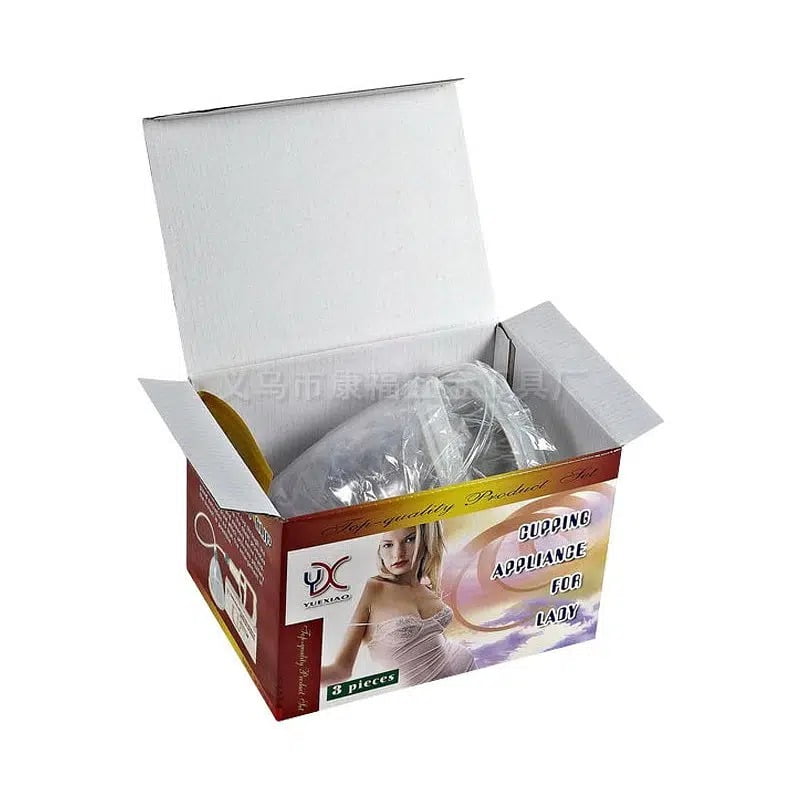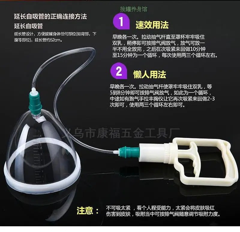 Cupping type breast apparatus, by emptying the air in the cup, to the vacuum pressure of the chest, increase the breast tissue. Diffusion tensor and intravascular blood circulation velocity, to achieve the effect of strength training. According to physiological principles, through the mechanical increase of chest muscle movement, promote blood circulation, direct Breast cavnosum increases, makes short-term flat small breasts voluminous and blunt, strengthens women’s curves Beauty, add feminine charm, can also solve the size of the breasts, nipples, breast lumps and sagging postpartum breasts and others Flaws, it is a modern health care product that is in demand by female bodybuilding.